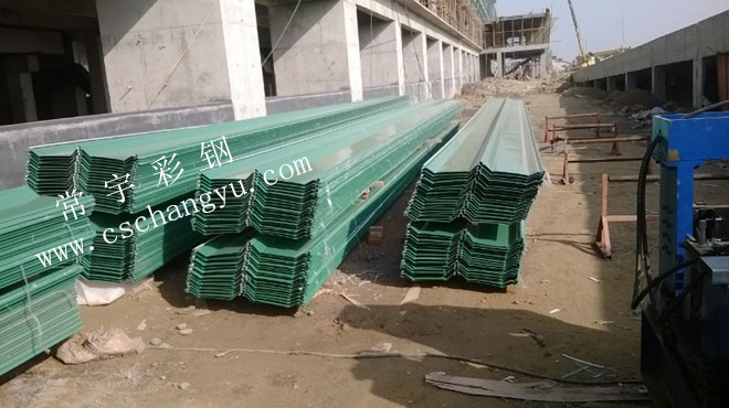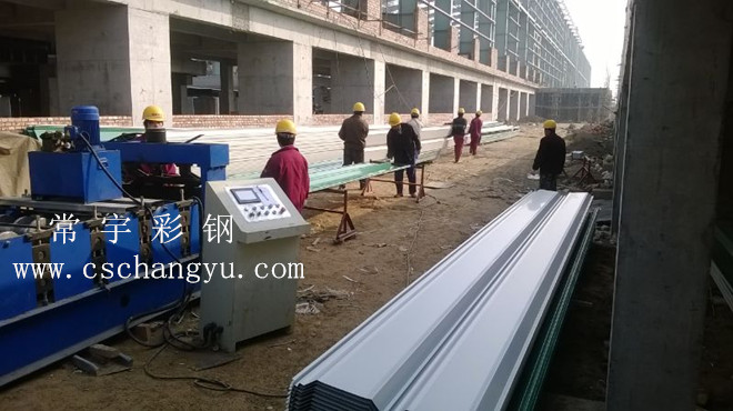 發(fā)布時間:2013-12-15來源:常宇彩鋼作者:常宇彩鋼瀏覽次數(shù):(0) 經(jīng)過雙方友好協(xié)議,2013.10月20號760設(shè)備到達山東工地現(xiàn)場,我司派一名操作技師現(xiàn)場壓型,與施工單位互相配合,滿足工程安裝需求。材料名稱為760型暗扣式鋁鎂錳屋面板。長度長達16m。