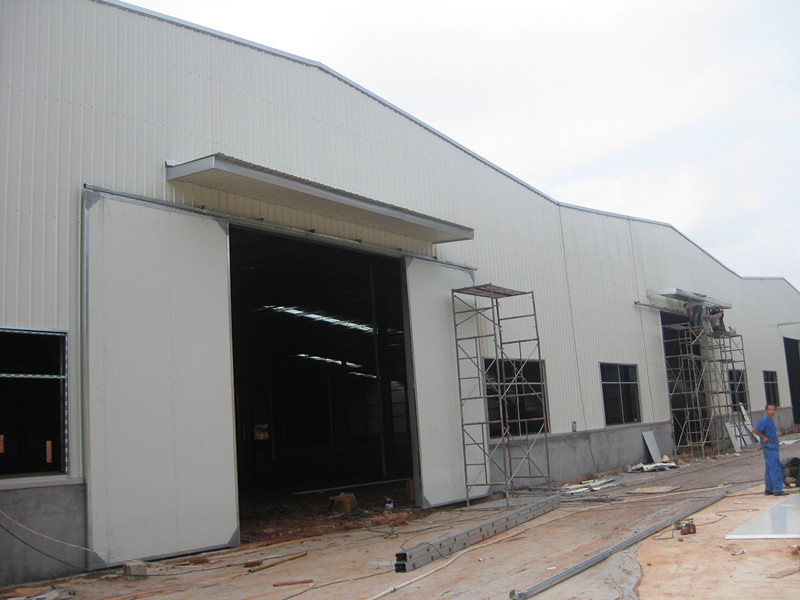 連跨鋼結(jié)構(gòu)廠房:連續(xù)7連跨鋼結(jié)構(gòu)廠房,每跨20M長。面積約12000平方。布置中、邊排水天溝。屋面檁條采用C型鋼C180型,墻面檁條采用C140型,屋面結(jié)構(gòu)采用820型暗扣式彩鋼瓦+采光帶+保溫棉+鋼絲繩+中邊支扣件,板長度長達15M。墻面板采用900型彩鋼瓦,長度8M。大門采用彩鋼夾芯板+軌道,窗戶收邊、墻角及屋面脊瓦采用彩鋼板定形加工。
