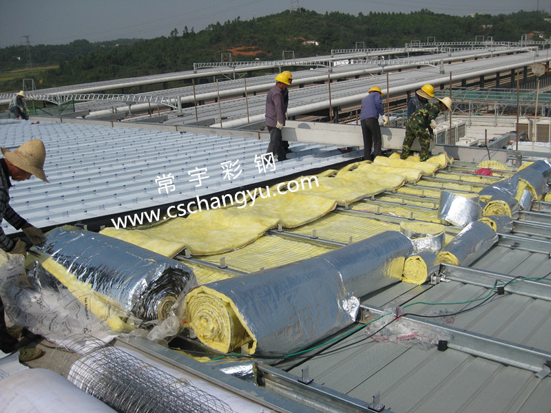 防水層、保溫棉鋪墊現(xiàn)場,鋁合金支座施工現(xiàn)場,鋁鎂錳板安裝現(xiàn)場